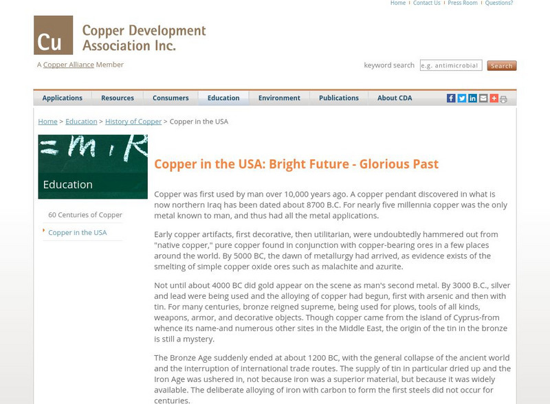 This page describes the history of copper use in the United States and the future of copper in industry. Contains a good overview of copper use in the U.S.