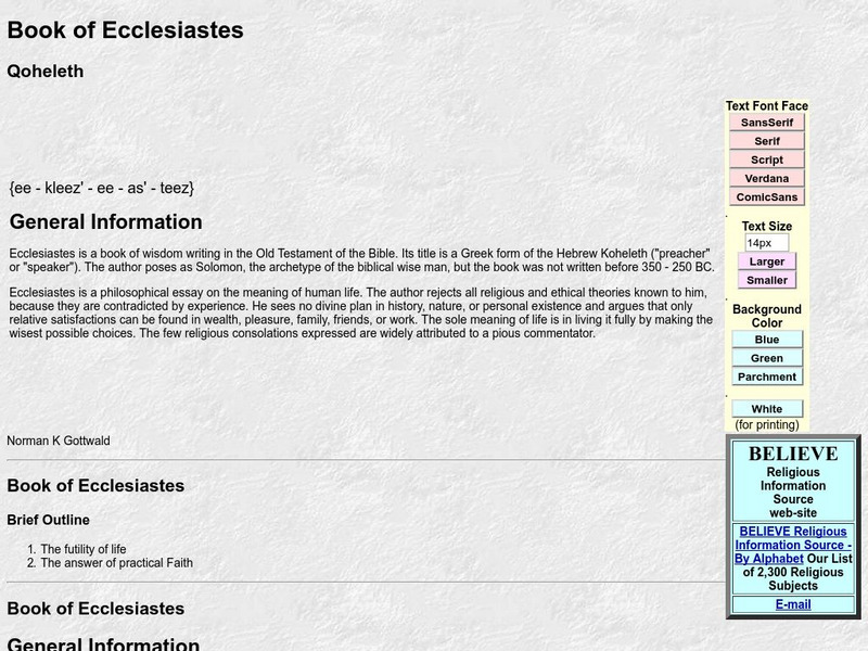 A detailed overview of the Book of Ecclesiastes that gives "General Information" and "Advanced Information" from a Catholic and Jewish perspective.