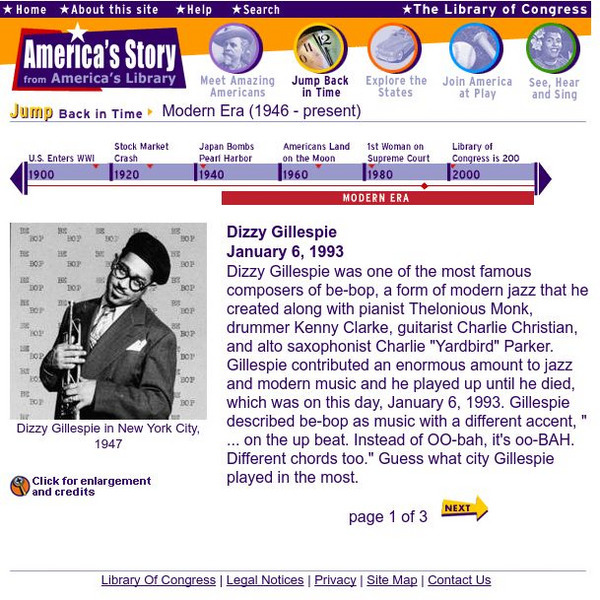This PBS biography about trumpeter and jazz musician Dizzy Gillespie includes photos, multiple audio features, and links within the text to other famous musicians.