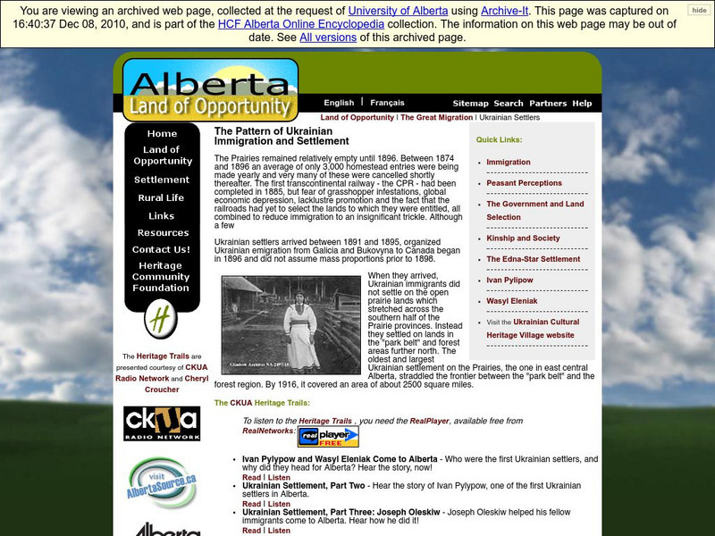 A detailed article focusing on the waves of Ukrainian immigrants who settled across the Canadian prairies. Links to additional topics are found on the right side menu bar making this encyclopedia entry a fine resource.