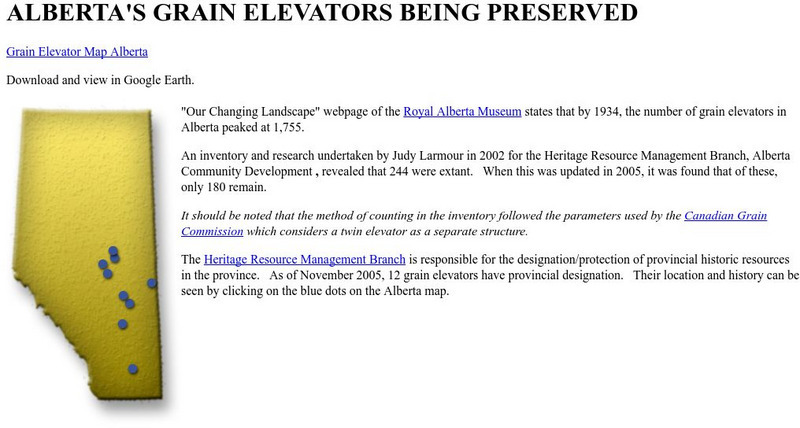 A map containing the location of nine of Alberta's Grain Elevators points to information about each of these structures from their construction to their usage to their current status.