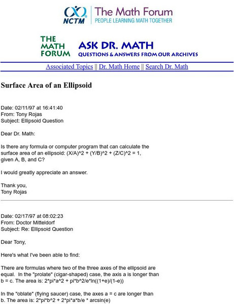 The Math Forum: Ask Dr. Math: Calculating Surface Area of an Ellipsoid