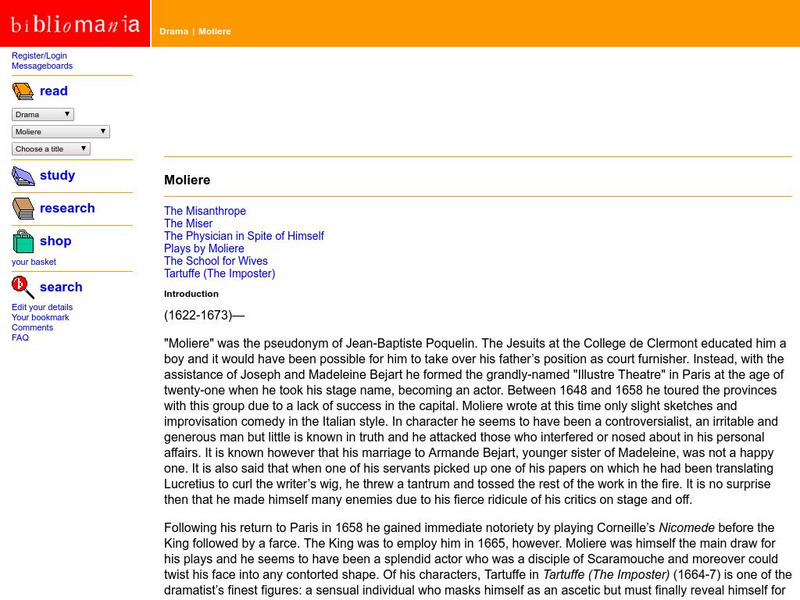 A biography of Moliere precedes a free collection of his works, including "The Misanthrope," "The Miser," "The Physician in Spite of Himself," "Plays," "The School for Wives," and "Tartuffe."