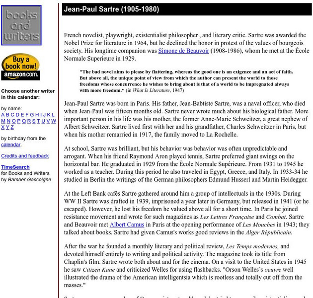 This site gives a biography of French novelist, playwright, existentialist philosopher, and literary critic, Jean-Paul Sarte. It provides his life overview, a list of major works with a bibliography, quotations, and links to further...