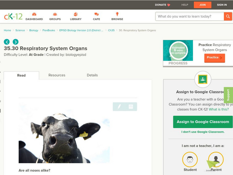 [Free Registration/Login may be required to access all resource tools.] In the following online tutorial students will identify the organs of the respiratory system.