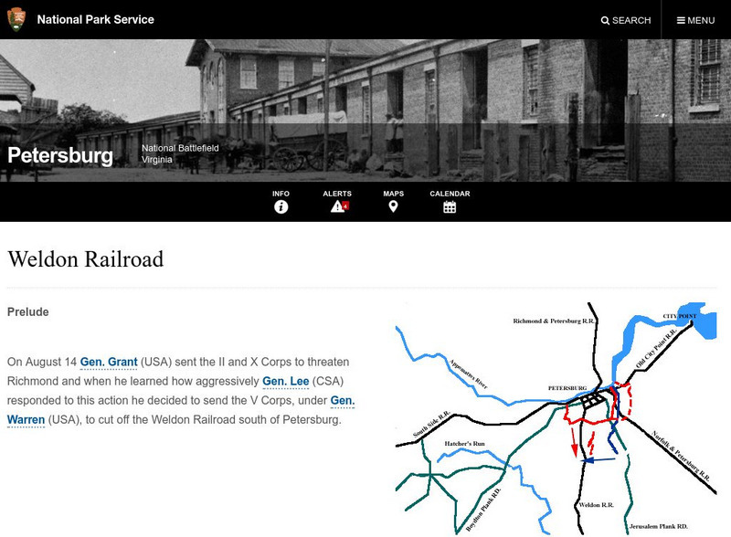A day-by-day look at Grant's attempt to cut off rail supplies to Lee in Petersburg by capturing the Weldon Railroad. From the National Park Service.