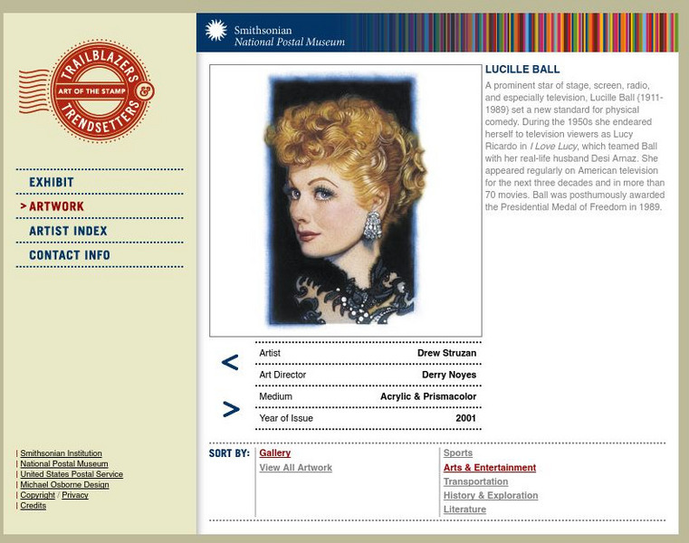 View the artwork for a U.S. postage stamp issued in 2001 to commemorate television star Lucille Ball. With a short biographical passage of her accomplishments in television, radio, screen and stage.