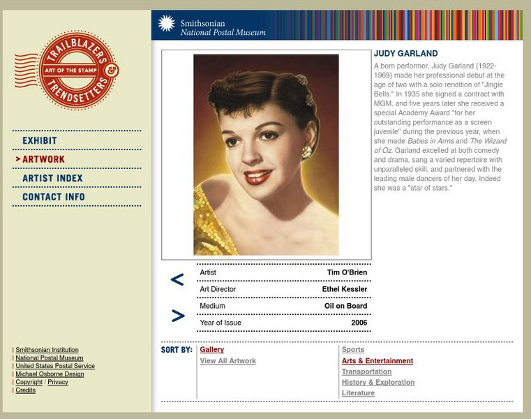 View the artwork for a U.S. postage stamp issued in 2006 to commemorate Judy Garland. With a short passage on her life and star quality.
