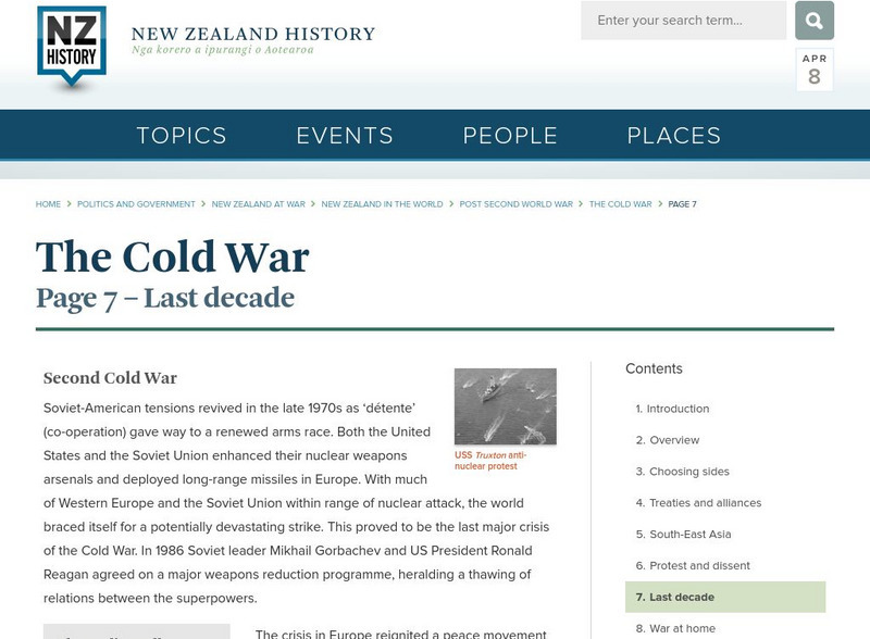 Describes New Zealand during the Cold War. Looks at New Zealand's political landscape during WWI, WWII, its military interventions, its membership in SEATO, and its antinuclear stance.