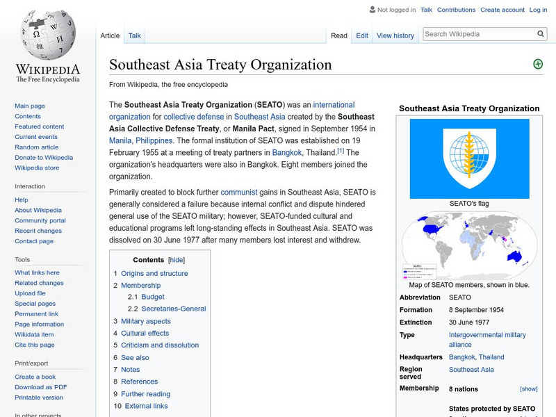 This Wikipedia site provides readers with a list of Southeast Asia Treaty Organization (SEATO) member countries, reasons it was established, and dates it was implemented and disbanded. Includes links to concepts that may require further...