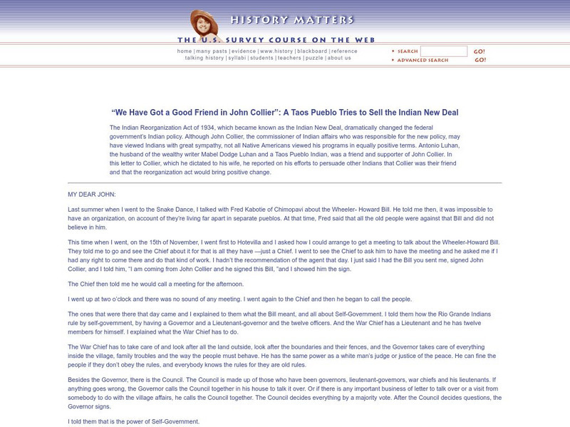 The Indian Reorganization Act of 1934, which became known as the Indian New Deal, dramatically changed the federal government's Indian policy. This letter by Antonio Luhan to the then-Indian Commissioner gives an impression of its...