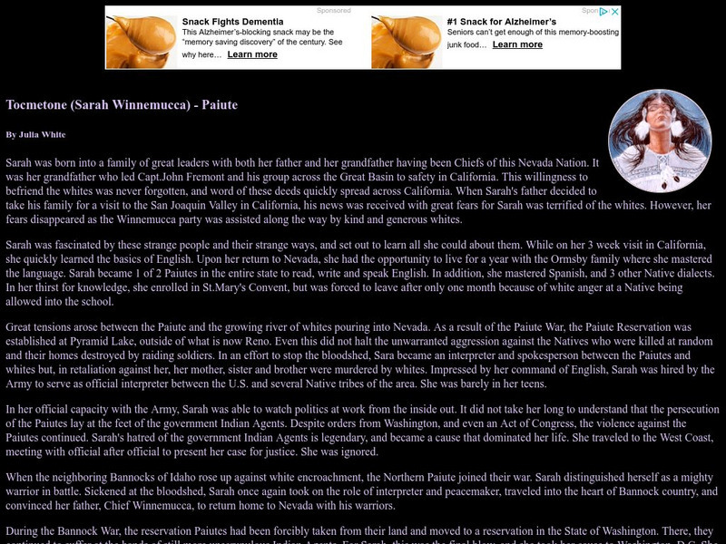The National Women's Hall of Fame offers a biography of the extraordinary life of Sarah Winnemucca of the Paiute Indians.