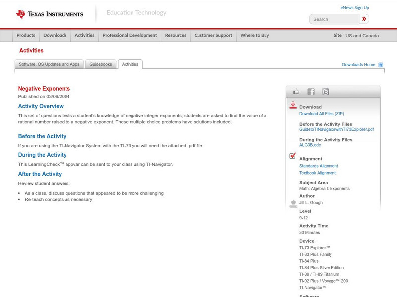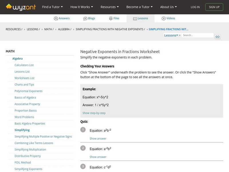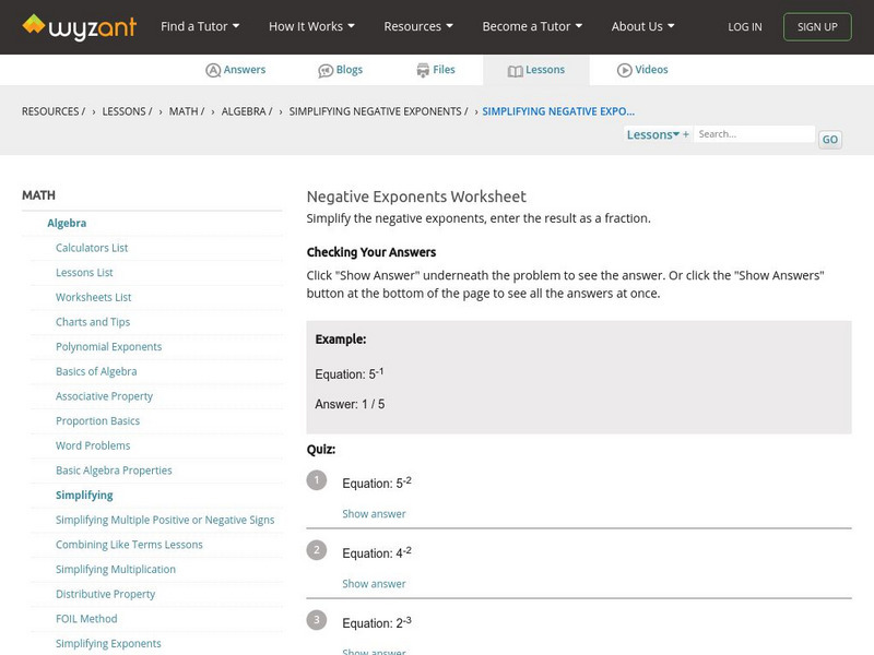 At this site from WyzAnt, students are to simplify ten questions where variable bases are raised to negative exponents. An answer sheet is provided so that students can check their solutions once they have finished.
