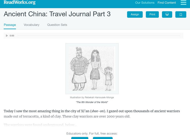 [Free Registration/Login Required] This passage contains a journal that recounts travel observations of ancient Chinese warrior terracotta statues in Xi'an, China. This passage is a stand-alone curricular piece that reinforces essential...