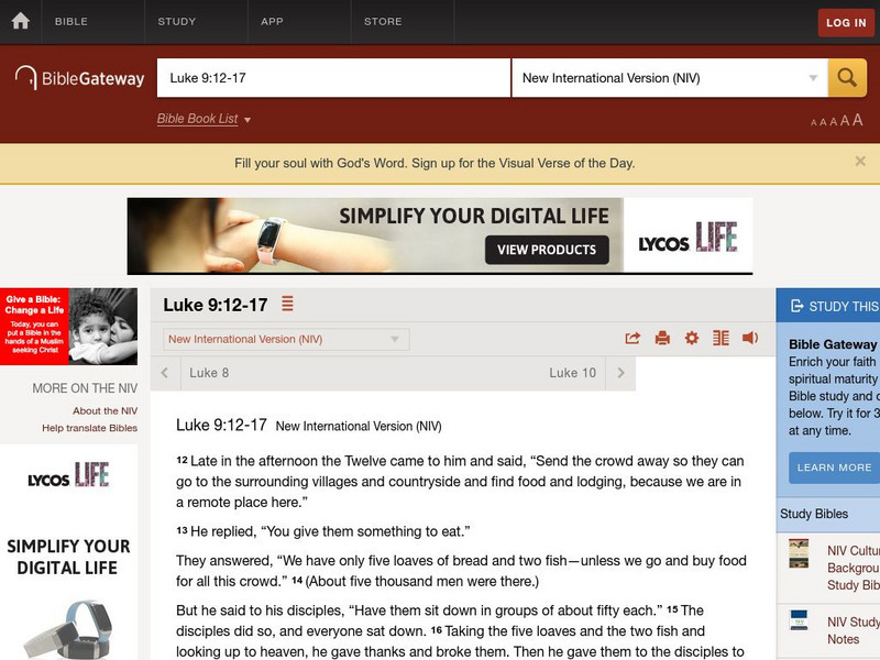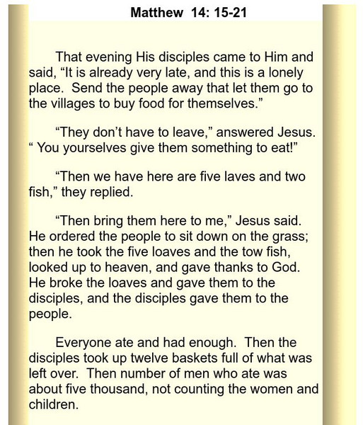 An account from Luke in the Bible where Jesus feeds 5000 people from five loaves of bread and two fish. Audio of this passage is also available.