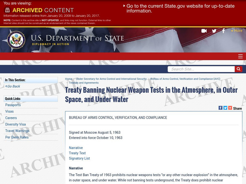 The U.S. Department of State provides a comprehensive overview of the Limited Test Ban Treaty, followed by the full text of the treaty as signed in 1963.