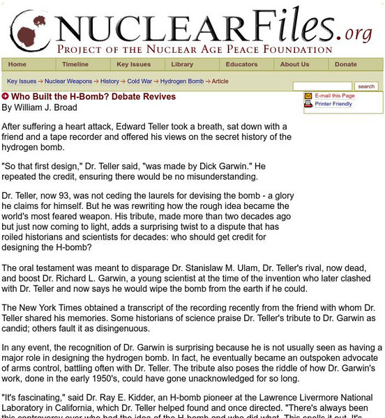 Nuclearfiles.org: Who Built the H Bomb? Debate Revives