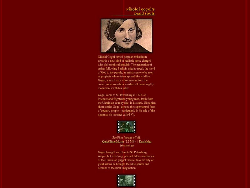 This PBS site discusses the influence of Ukranium folk tales on Gogol's work. Includes audio/video excerpts from the film versions of Vij, The Overcoat, and Dead Souls.