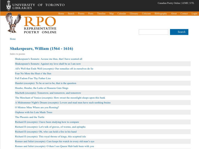 Not only is Shakespeare famous for his plays, but for his sonnets and songs, as well. View his poems here, including "The Phoenix and the Turtle", "Shall I Compare Thee to a Summer's Day", and other sonnets.