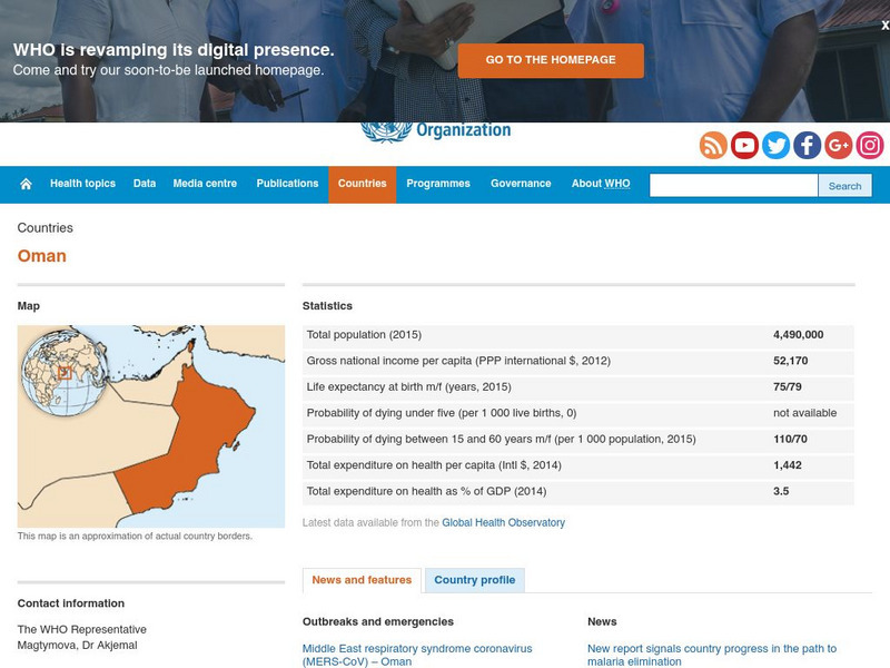 Features a country profile of the Arab nation of Oman, background details, and numerous links to comprehensive information on the nation's culture, history, geography, economy, environment, population, news, government, and much more.