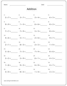 In this addition worksheet, students add one digit numbers together horizontally. Students complete 36 addition problems on this worksheet.