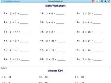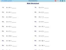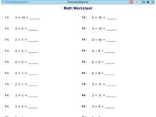 In this addition worksheet, students add one digit numbers to two digit numbers with regrouping. Students complete 30 problems total.