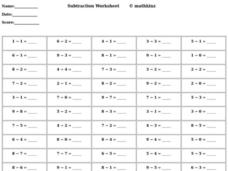 In this subtraction worksheet, students complete subtraction problems involving one digit numbers. Students complete 55 problems on this worksheet.