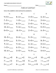 In this addition and subtraction instructional activity, students complete addition and subtraction problems containing one digit numbers. Students complete 52 problems.