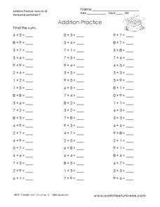 In this addition activity, learners add one digit numbers together to find a sum. Students add 21 problems on 2 pages involving one digit numbers.