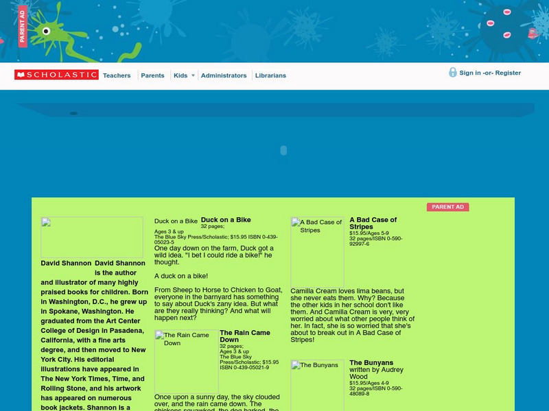 Learn about David Shannon's many books for children at this site. There is a brief description of the story as well as the cover illustration.