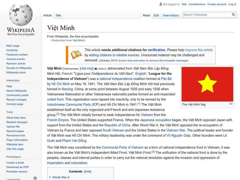 This site from Wikipedia provides a brief description of the Viet Minh. Looks at when they were formed, reasons they fought, and military campaigns. Includes links to terms that may require further clarification.