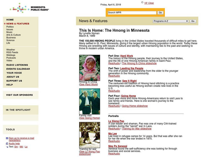 This radio series gives an up-close-and-personal view of Hmong history, culture and the challenges of resettling in the U.S. Listen to, or read transcripts of, interviews with Hmong refugees, a clan leader trained by the CIA as part of...