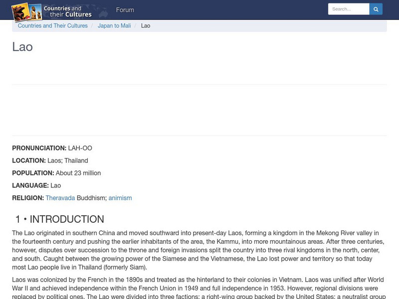 Features a country profile of the Asian nation of Laos, background details, and numerous links to comprehensive information on the nation's culture, history, geography, economy, environment, population, news, government, and much more.