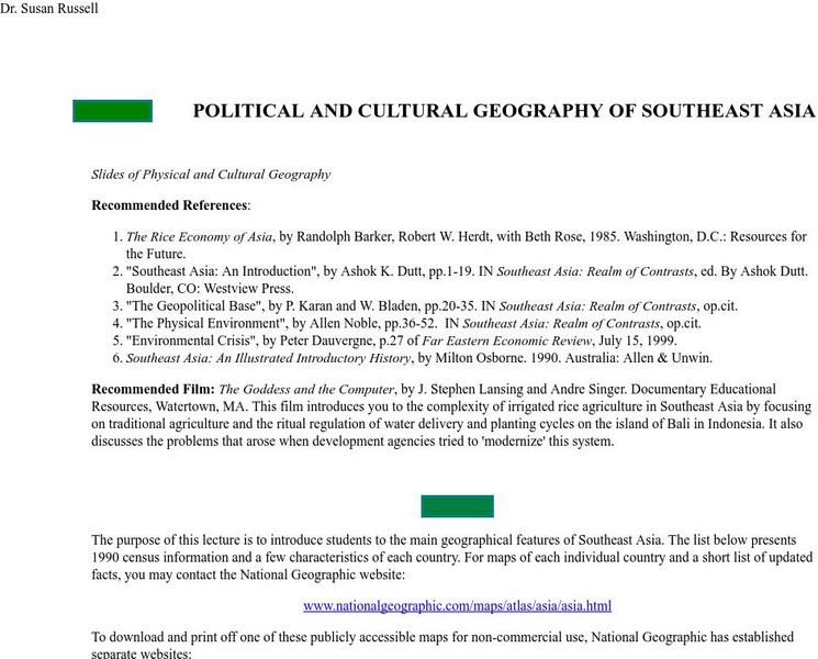 This page provides a good introduction for students to the main geographical features of Southeast Asia. Provides information on the individual countries that make up Southeast Asia and gives some physical geographical facts about...