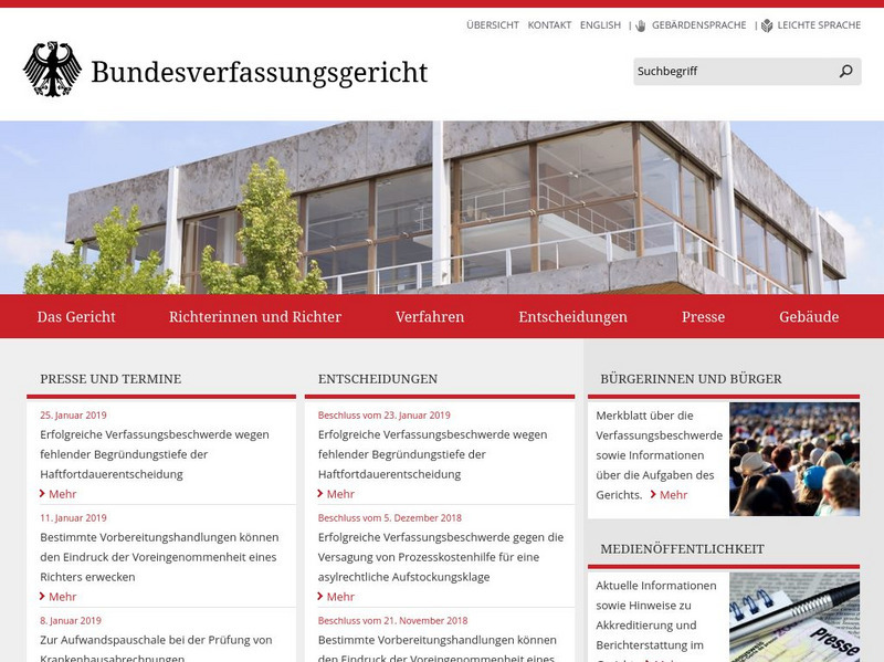 Official site of the Federal Constitutional Court (Bundesverfassungsgericht). Provides detailed information about the judges, the role of the court, its organization, proceedings and so on. Included also are press releases and...
