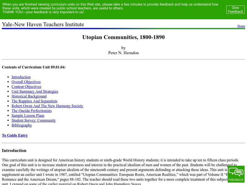 Yale New Haven Teachers Institute: Utopian Communities, 1800 1890