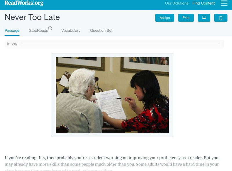 [Free Registration/Login Required] An informational text about adults who believe it is never too late to learn to read. A question sheet is available to help students build skills in reading comprehension.