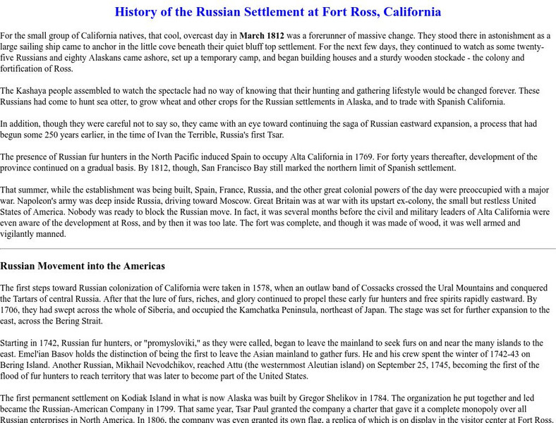 History of the Russian Settlement at Ft. Ross,california
