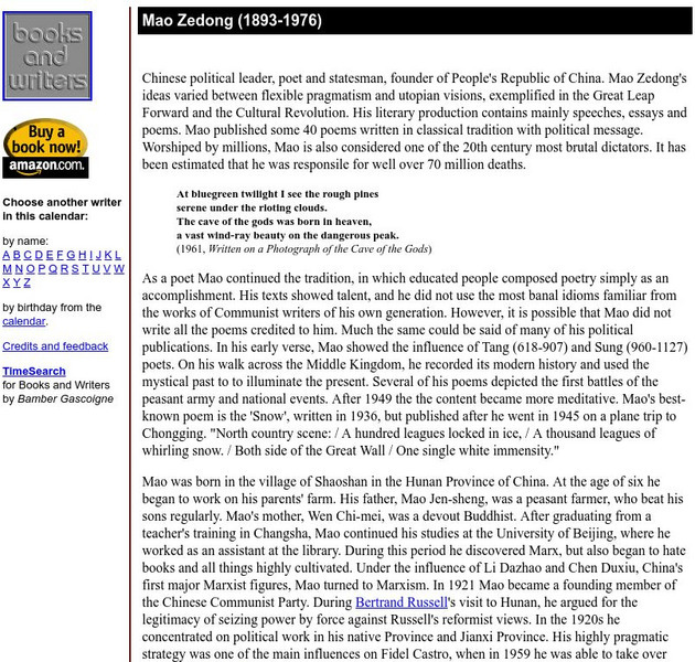 Visit this site for a biographical sketch of the life of Chinese dictator Mao Zedong. It discusses his political career, as well as his literary career. A bibliography of his selected works is also provided.
