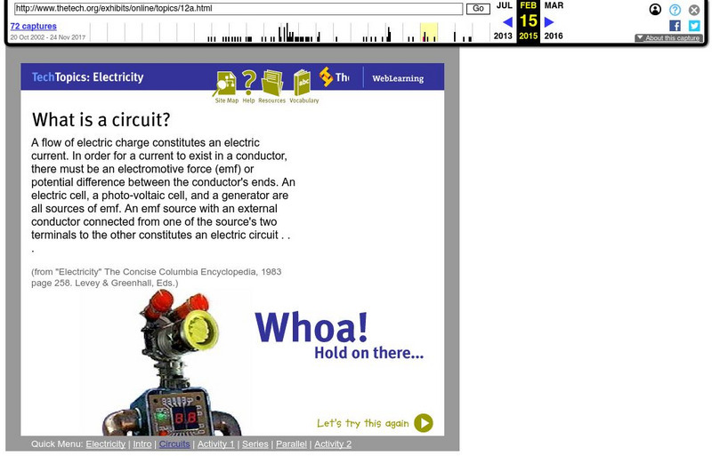 An exciting interactive site of games, activities, information, and quizzes about electric circuits. You'll learn what makes circuits work, all about conductors and insulators, switches, changing circuits, and circuit diagrams. Learning...