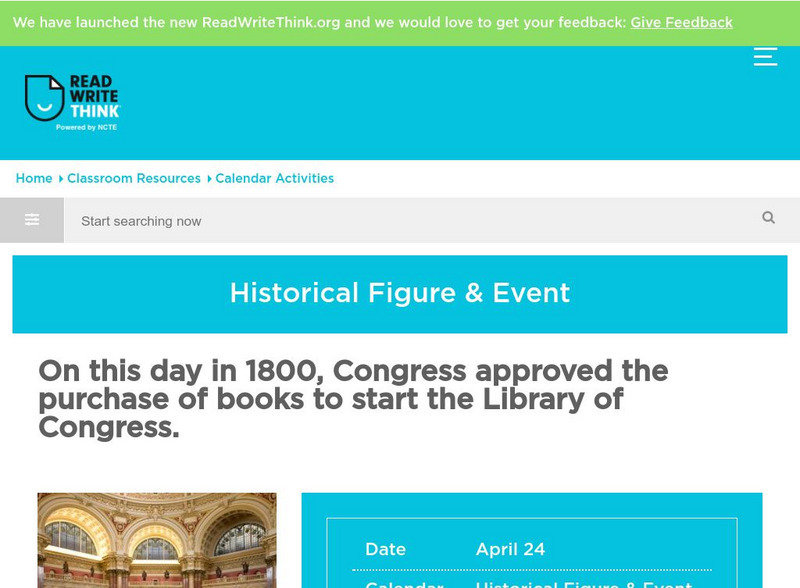 Research activities for students commemorating the day in 1800 when Congress approved the Library of Congress. Provides lesson plans, web links, and a bibliography. From ReadWriteThink's calendar on April 24, 2007.