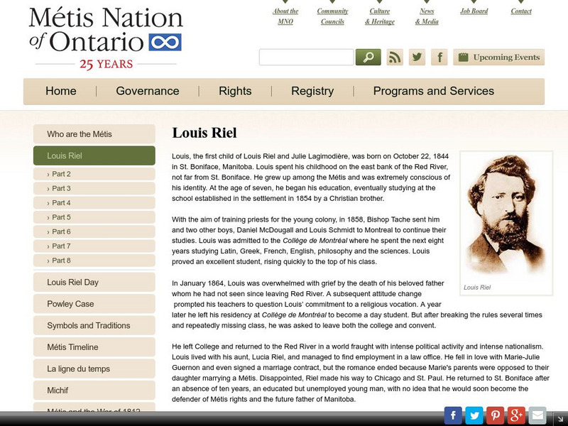 A detailed biography of the famous Metis rebel, Louis Riel. The Metis Nation of Ontario present information on Riel's early life, his leadership during two resistances, and his eventual capture and execution in 1885.