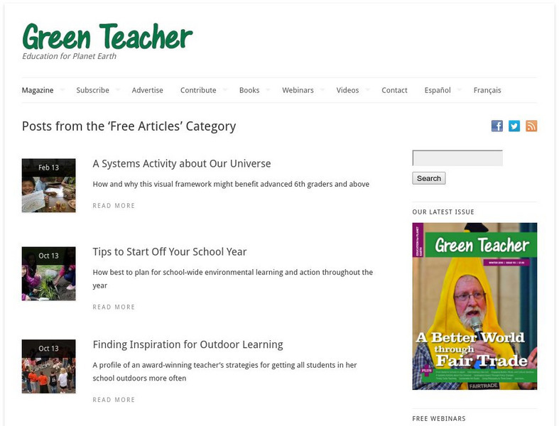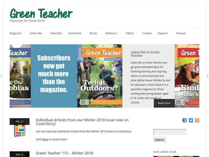 Green Teacher is a well established Canadian magazine for environmentally conscious educators. Each issue highlights environmental issues around the world, and includes lesson ideas. Visitors can register for free webinars. A past issue...