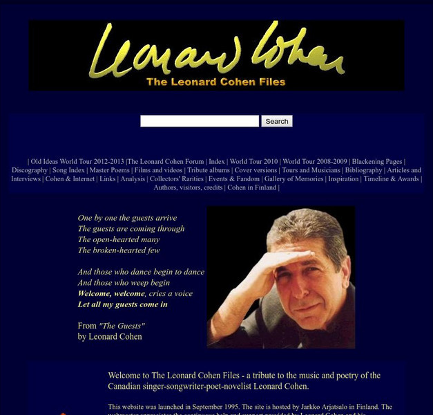 This is a vast web site devoted to the writings, art and music of Leonard Cohen, who also contributes to the site. It seems to mention everything he has published and some things he hasn't. There are many photos on the site that cover...