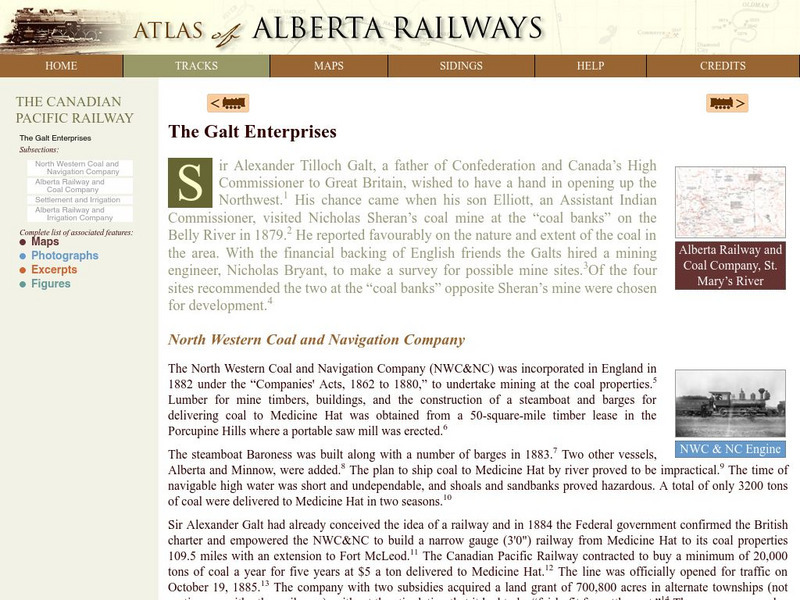 This is a brief history that describes the establishment of the Alberta Railway by Alexander Tilloch Galt. It would be a means of moving coal from his companies coal properties to Medicine Hat. Included are maps, photographs and primary...