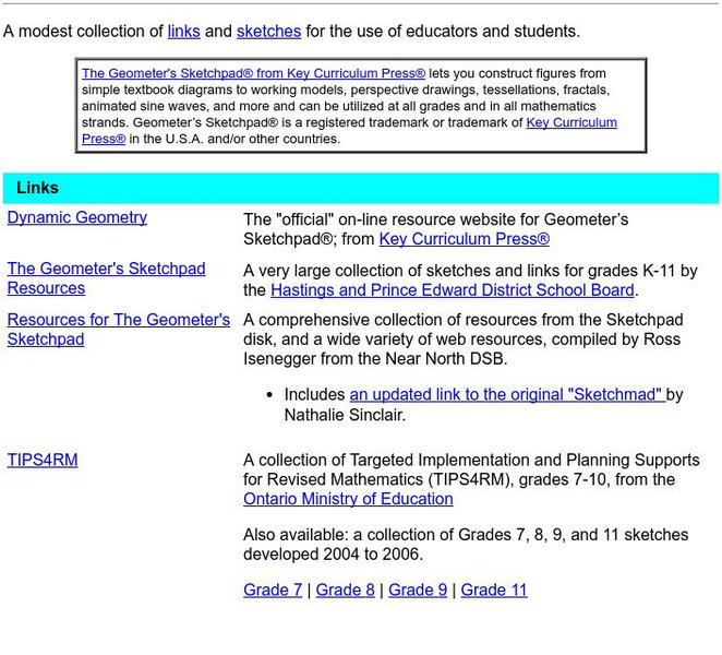 Sketchmad-dot-ca provides lessons and sketches for junior grades upwards to use with The Geometer's Sketchpad. The software is necessary for making use of the resources here.