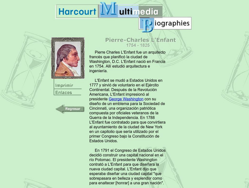 A description of L'Enfant's service in the United States, including service in the Revolutionary War and planning the layout for the nation's capital. (In Spanish)
