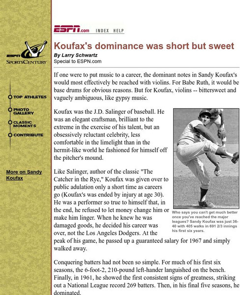 Explore the career of the National League record holder for no-hitters, Sandy Koufax, at this site from ESPN.