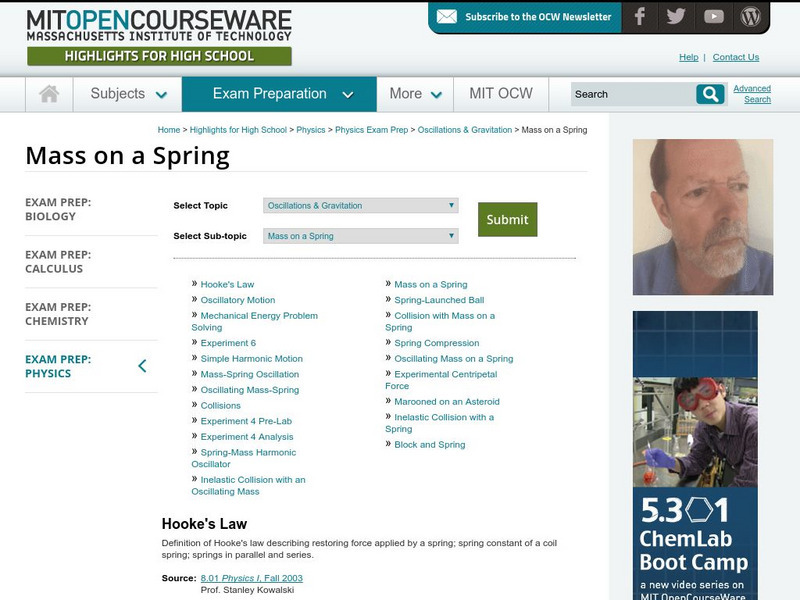 Students explore mass on a spring. Some topics examined in the activities are Hook's law, sinusoidal motion, and oscillatory motion. The resource consists of video clips, lecture notes, practice problems, and exam questions. Practice...