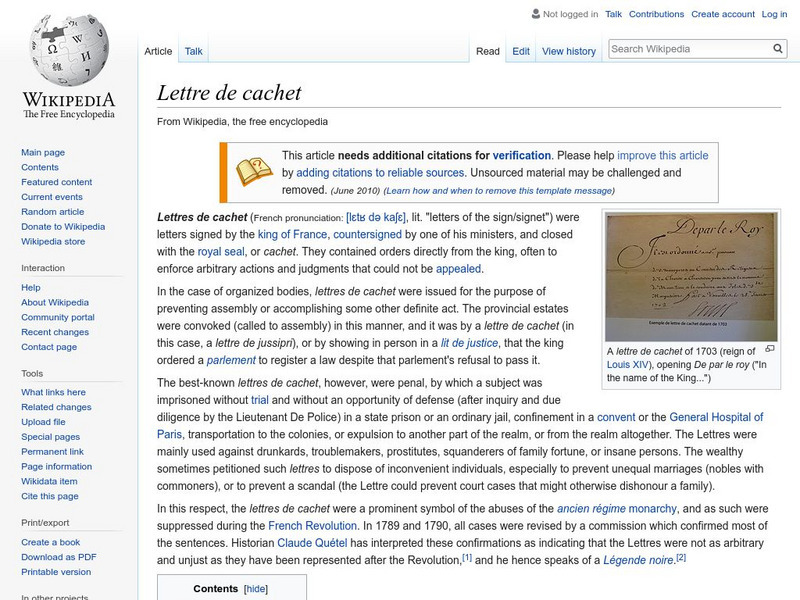 An explanation of the French documents called lettres de cachet, by which people could be imprisoned without trial or recourse. This site provides a clear explanation of why such letters came into being, how they were historically used,...